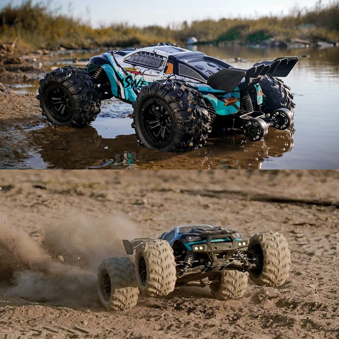 Conquers flat ground, grass, sand, and mud with ease thanks to aggressive big-foot tires and 4WD grip.